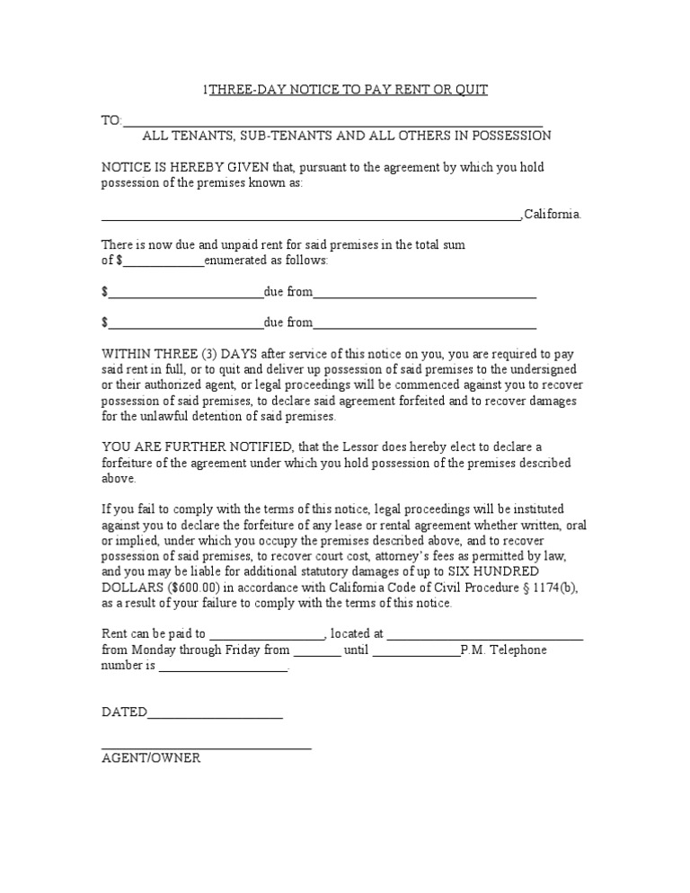 3 Day Notice To Pay Or Quit California Template