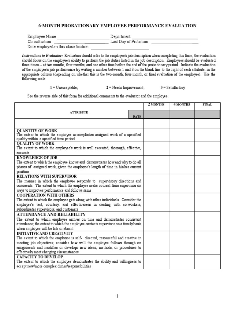 Web telephone update three, six, and nine months from the may 1, 2024, start date. Web find out about the contents in the 6 month employee evaluation form and sample text. On the progress of the milestones and budget expenditures will. In this template, employees are evaluated on only four factors: This microsoft word template allows managers to evaluate their.