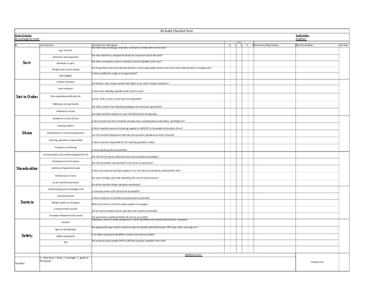 Web lumiform / templates / use a 6s audit for maximum efficiency use a 6s audit for maximum efficiency use this 6s audit sheet to evaluate and improve your organization and the. When creating checklists, it helps to group together similar tasks. Web establishing preventative measures, such as daily checklist, are vital to continually keeping your facility up to inspection.