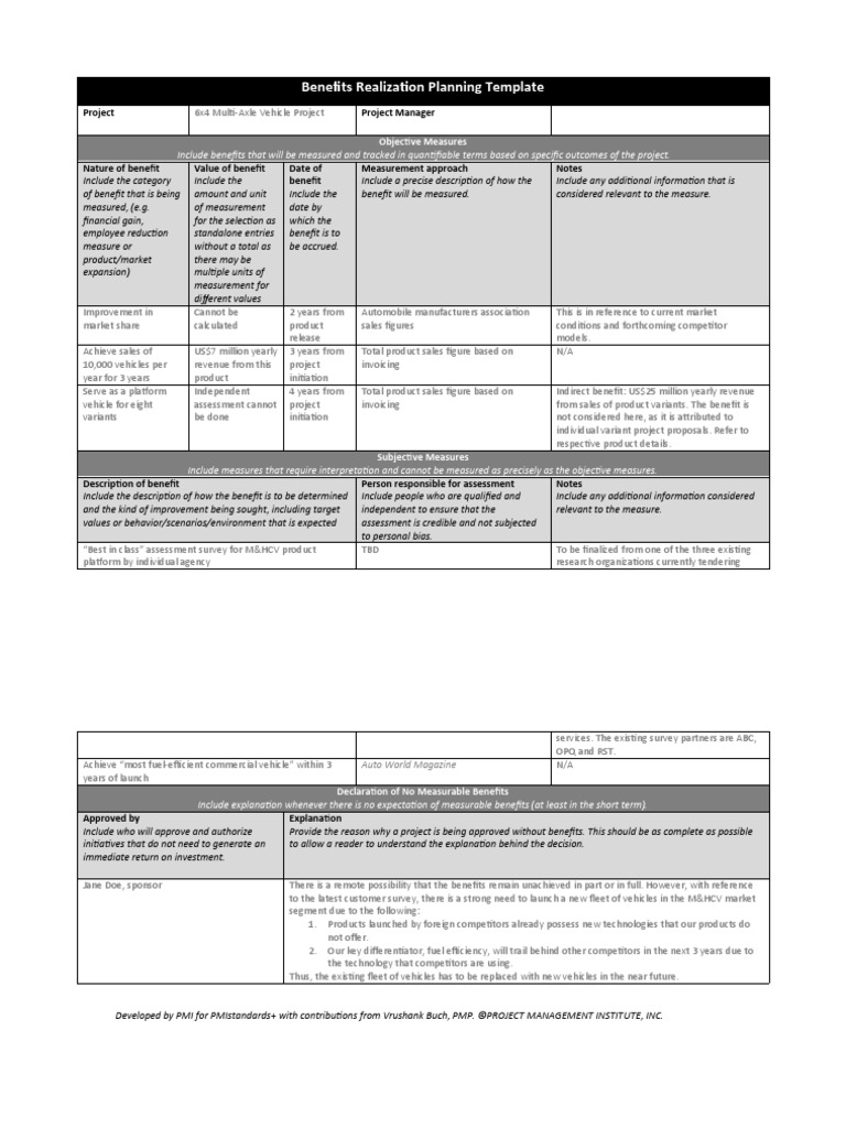 The purpose of the project; Web benefits of document. A practice guide, pmi’s first standards publication in its 50th anniversary year, seeks to close this gap and will help you drive more successful. Web the benefits realization plan should identify that dependency to allow for the hiring of resources and/or the securing of funding in a timely way. Web using a benefits realisation template (or benefits realisation framework) has advantages for a few reasons. Not all projects will have objective measures, but it is not. Web writing the benefits realisation plan. Web benefits realization planning template. Log this template aims to tie business case commitments to specific tracking activities and measures. Web the pmi benefits realization model defines a structured set of phased to support the identification of, analysis of, monitoring and control of, the transition of, and. It describes the tasks, resources, time frame and approach. Web the benefits realisation plan provides details of how the benefits process will be applied to a program. This template aims to tie business case commitments to specific tracking activities and measures. A document outlining the activities necessary for achieving the planned benefits. The benefits management approach i.e. Plan the activity to realise. To begin with, it ensures that each project’s impact is measured in. Web some suggested topics you should include in the plan: Web benefits realization management is in charge of the study of profitability and profitability probabilities: Web benefits planning ensures a robust plan for the delivery of the benefits, with defined timescales and responsibilities.