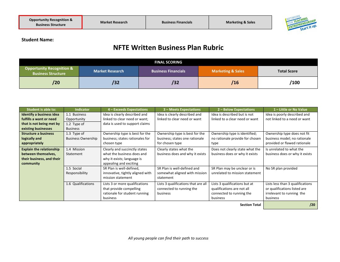 Business Plan Rubric Template