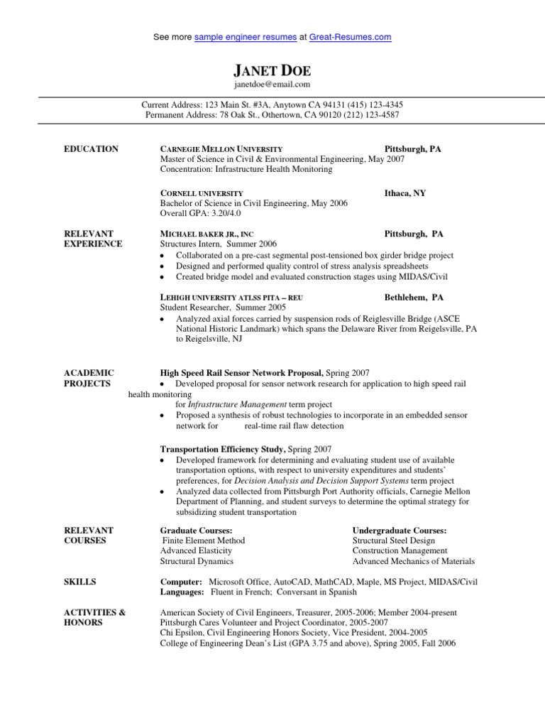 Sample Civil Engineer Resume PDF Carnegie Mellon University Civil