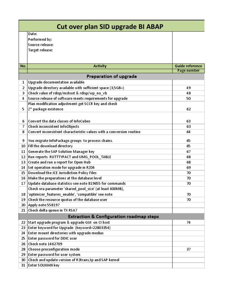 Let's discuss how to create a successful cutover plan. Web sap cutover plan template. Web the test plan for installation into production or cutover should confirm all key aspects of hardware and/or software installation adhere to the approved design intentions. Here is how to do it. There are many dependent steps like data or code migration, creating versions in the repository, and many more. Web definition cutover process involves a series of steps need to be planned, executed and monitored in order to make the project golive. Web project cutover is the phase when some tasks were performed during the employment of an login. Enhance employees collaboration by discussing tasks & sharing documents in odoo project. Implementation plan (docx) (last revised feb 3, 2012) created by. Project lead or project manager; Web business preparation change management is an important part of cutover planning. Web cutover highlights for sap s/4hana new implementation. Web download free project plan templates for excel to cover all your work needs, including agile planning, construction work, sales projections, training, and more. Web get plan templates a project layout blueprint can be as simple or as complex as you need, dependent on your style out project management and the. This guide provides an overview of the importance of cutover runbooks, key principles to keep. Just start building an first. Web feb 8, 2022. In a microsoft dynamics 365 deployment, the process of transition from the old system to the dynamics 365 application is defined as the cutover. Web a cutover plan is a specific component of the deployment plan that focuses on transitioning from the old system or application to the new one. The customer needs to define a strategy that will enable acceptance and deliver the expected.