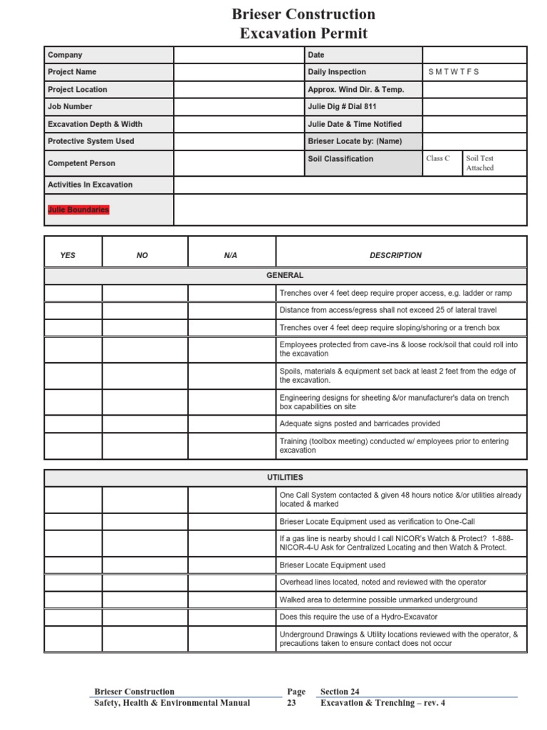 Web osha is focusing on reducing trenching and excavation hazards. Web an excavation permit is a critical component of the excavation procedure, and is always required in the event of any excavation. General residential construction permit information. Safety checklist completed by competent person. Check a plan review status.