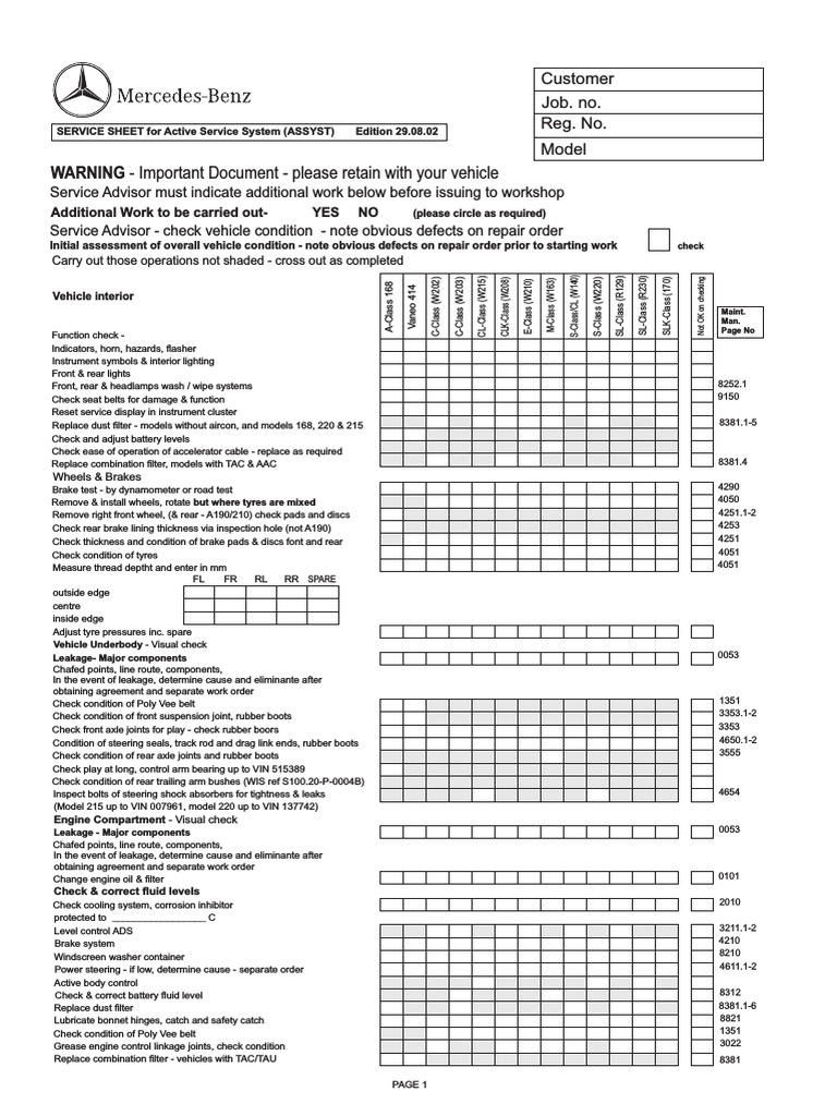 Mercedes Service B Sheet Checklist Headlamp Brake Prueba gratuita