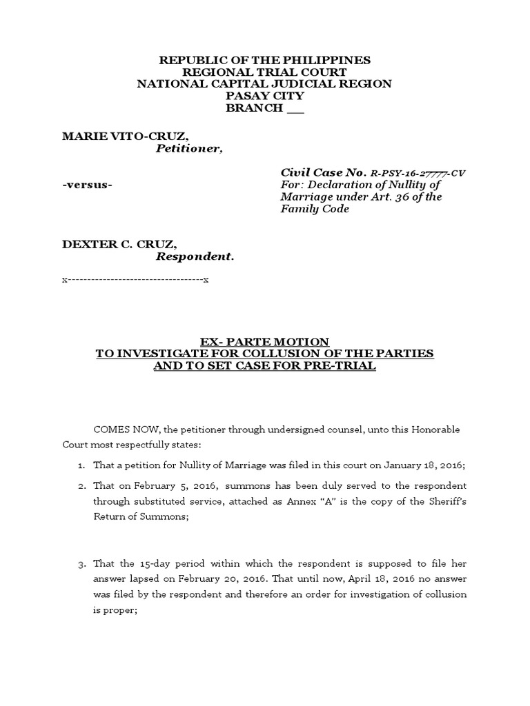Motion to Set for Collusion Hearing SAMPLE Annulment Prosecutor