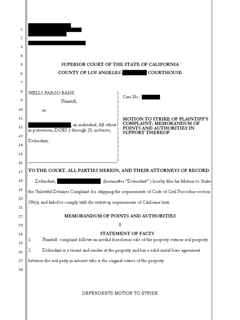 Sample Motion to Strike for California Complaint Lawsuit