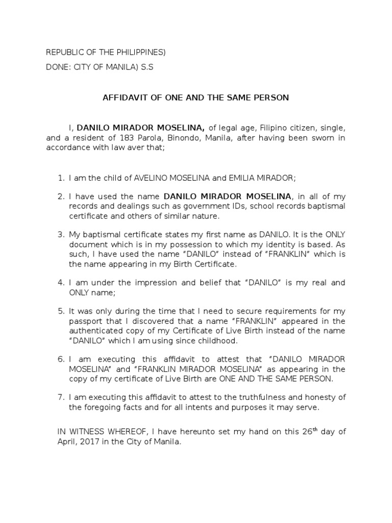 Involved parties names, places of residence and. Download this affidavit of one and the same person template design in word, google docs format. The affidavit of one and the same person is used to declare that two (or more) names pertain to the same. Edit your one and the same letter template online type text, add images, blackout confidential details,.