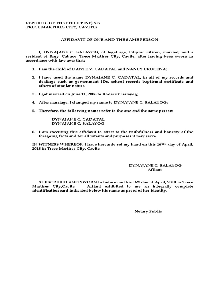 Affidavit of One and the Same Person Edited Affidavit Identity Document