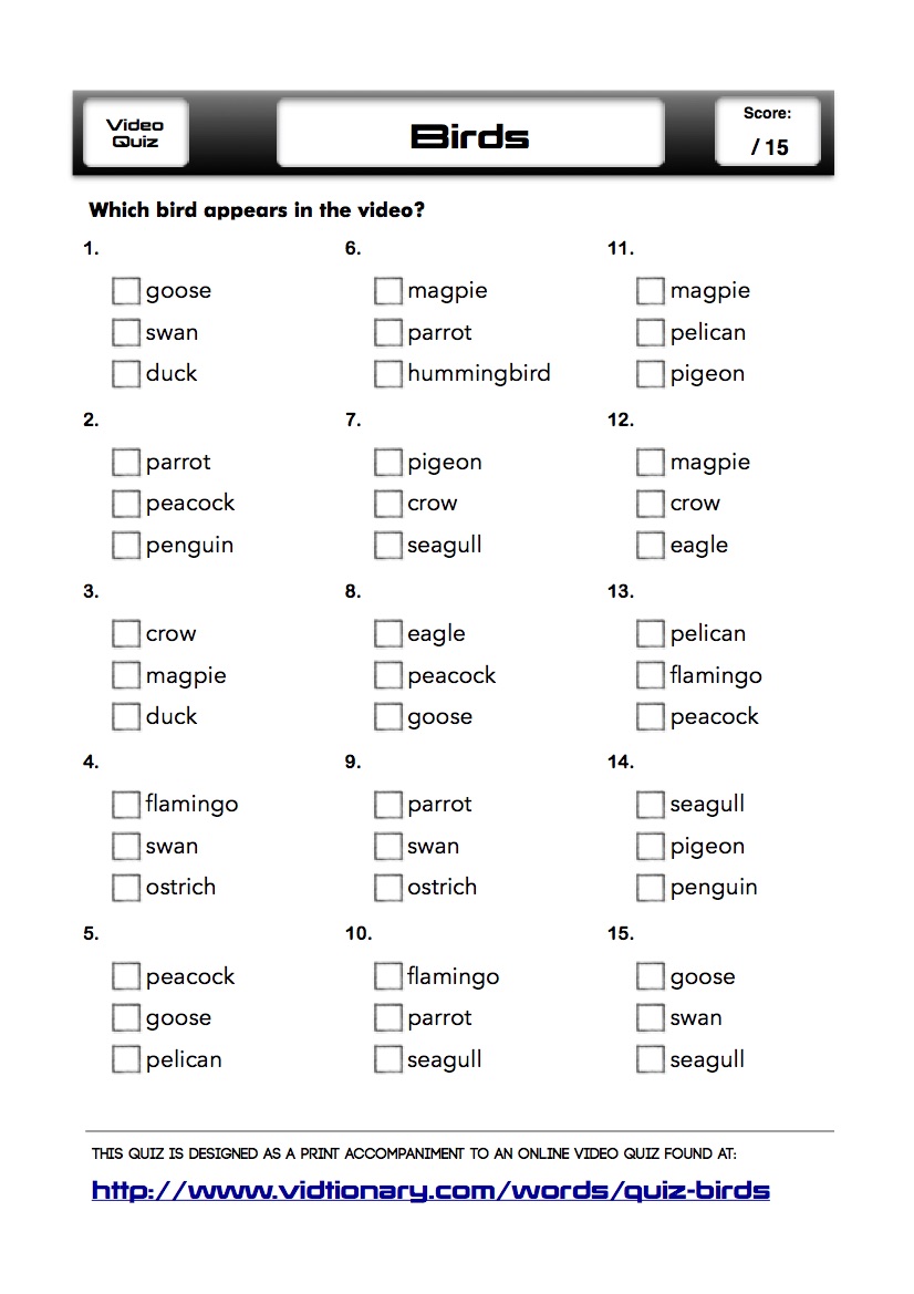 Printable Bird Quiz - Web question 1 of 3 birds are vertebrates. They have backbones they have wings they have feathers they have eyes next worksheet print worksheet 1. Web to come up with this many bird themed blue series words is quite incredible in my mind. Download the free paper bird craft template. Johannes fritz, a maverick austrian biologist, needed to come up with a plan, again, if he was going to prevent his rare and beloved birds from. You can move the markers directly in the worksheet. Web sample question birds: Web bird silhouettes — printable worksheet. Which bird lays the largest eggs? Over 225 trivia questions to answer.