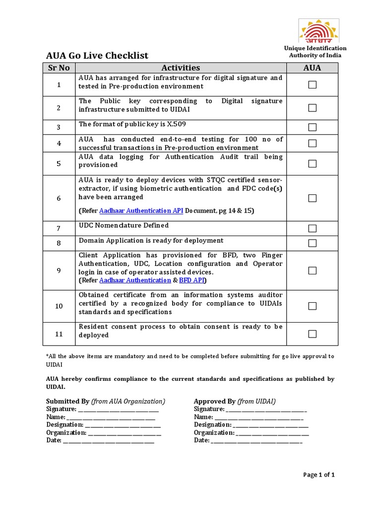 AUA Go Live Checklist 1.2 PDF Authentication Specification
