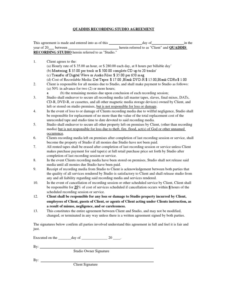 Web download this professionally made music recording contract template that record labels can use to assert their ownership of the product of a recording session and their. Your music recording contract should cover details like: Web make sure to check out the studio's location before booking a session. Establish glossary for working with an take enterprise. A music recording contract is a legal agreement between a music recording company and an artist or group that creates music. Web recording studio executives need ready copies of music contracts downloadable for free at template.net. Music contracts are important to ensure record labels have. Who should use a music recording contract? Web a producer agreement can be used to protect songwriters and recording artists from record labels and producers seeking to gain exclusive rights to their work. The agreement can be broken down into. Web hourly band practice space. Free information and preview, prepared forms for you, trusted by legal professionals Web take, sign & save a customized recording agreement with rocket lawyer. Web i) studio provides the recording studio in good working order but makes no special guarantees as to said studios functionality or suitability to client’s purposes. Web recording studio contracts are legally binding agreements between record labels and musicians that govern the ownership and distribution of products from recording. Web a recording agreement or contract is a legal document that states what the record company and artist agree to do for each other. Ad get access to the largest online library of legal forms for any state. If you just need a couple of hours and don't mind the load out, our hourly band practice space might be the right choice for your group. Recording companies use the contract to outline the terms for creating recorded music with the artist. Web this template is a demo recording agreement between a recording company and a recording artist.