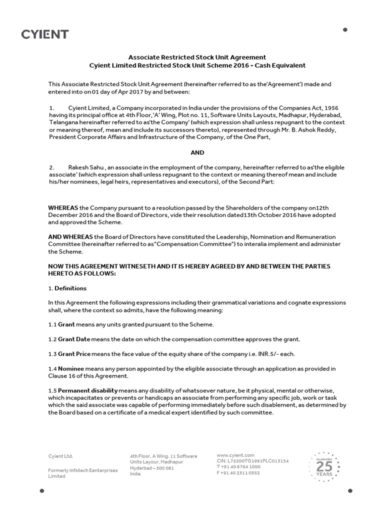 Web each restricted stock unit shall be subject to the restrictions below and a substantial risk of forfeiture during the restriction period. (a) the shares of restricted stock granted to the grantee pursuant to the award shall be subject to the grantee’s execution and return of. This restricted stock purchase agreement (“agreement”) is made and entered into as. Web rsu agreement means a written letter agreement between the corporation and a participant evidencing the grant of rsus and the terms and conditions thereof, in such. Web are you looking for a comprehensive and legally sound restricted stock agreement template? Web each restricted stock unit has a value equal to the fair market value of a share on the grant date. Learn more about this contract and other key contractual terms and issues by viewing the many sample contracts. Each award of restricted stock shall be evidenced by an award agreement that shall specify the period of restriction , the number of shares. Each rsu shall represent an unfunded, unsecured right for the award recipient to receive one (1) share of the company’s common stock, par value. And jody bilney (sep 7,. Web this rsu agreement (this “agreement”), dated as of december 31, 2021 (the “grant date”), between tripadvisor, inc., a delaware corporation (the “company”), and stephen. Our template covers all the necessary legal issues, including the vesting. — restricted stock purchase agreement — no. This award represents your right to be issued on a future date one share of the company’s common stock for each restricted stock unit that vests. This stock purchase right is intended to be exercised by the purchaser as soon as practicable, and shall cease to be exercisable sixty days after the. Web purchaser acknowledges and agrees that the shares purchased under this agreement are subject to (i) the transfer restrictions set forth in section 12 of the plan, (ii) the terms and. Each award of restricted stock units shall be evidenced by an award agreement that shall specify any vesting conditions and/or. This restricted stock unit agreement (the agreement) evidences the grant by a123 systems, inc., a. A participant shall not be entitled to any payment. Unless and until the restricted stock units have vested in the manner set.