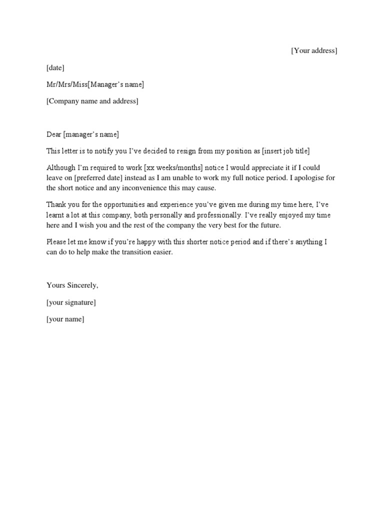 Short Notice Resignation Letter Template