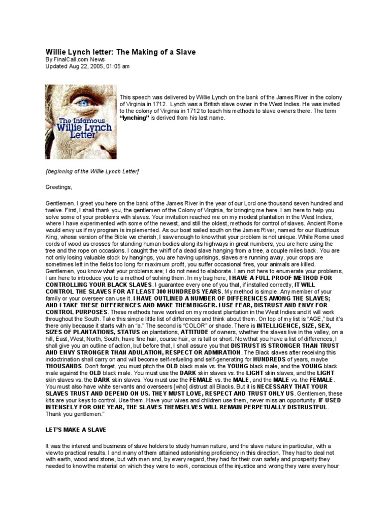 The william lynch speech, also known as the willie lynch letter, is an address purportedly delivered by a william lynch (or willie lynch) to an audience on the bank of the james river in virginia in 1712 regarding control of slaves within the colony. Get your online template and fill it in using progressive features. Edit your willie lynch letter.