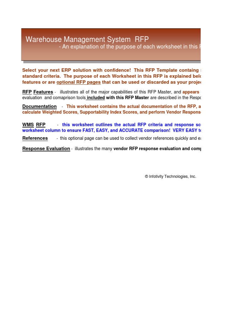 Creating an rfp with those features; Web the 2020 gartner magic quadrant report for warehouse management systems the 2021 warehouse management systems rfp template the 2020 gartner critical capabilities. Web warehouse management system rfp template and step by step guide download free guide find out about wms modules and capabilities before buying your next wms. There are several worksheets included.